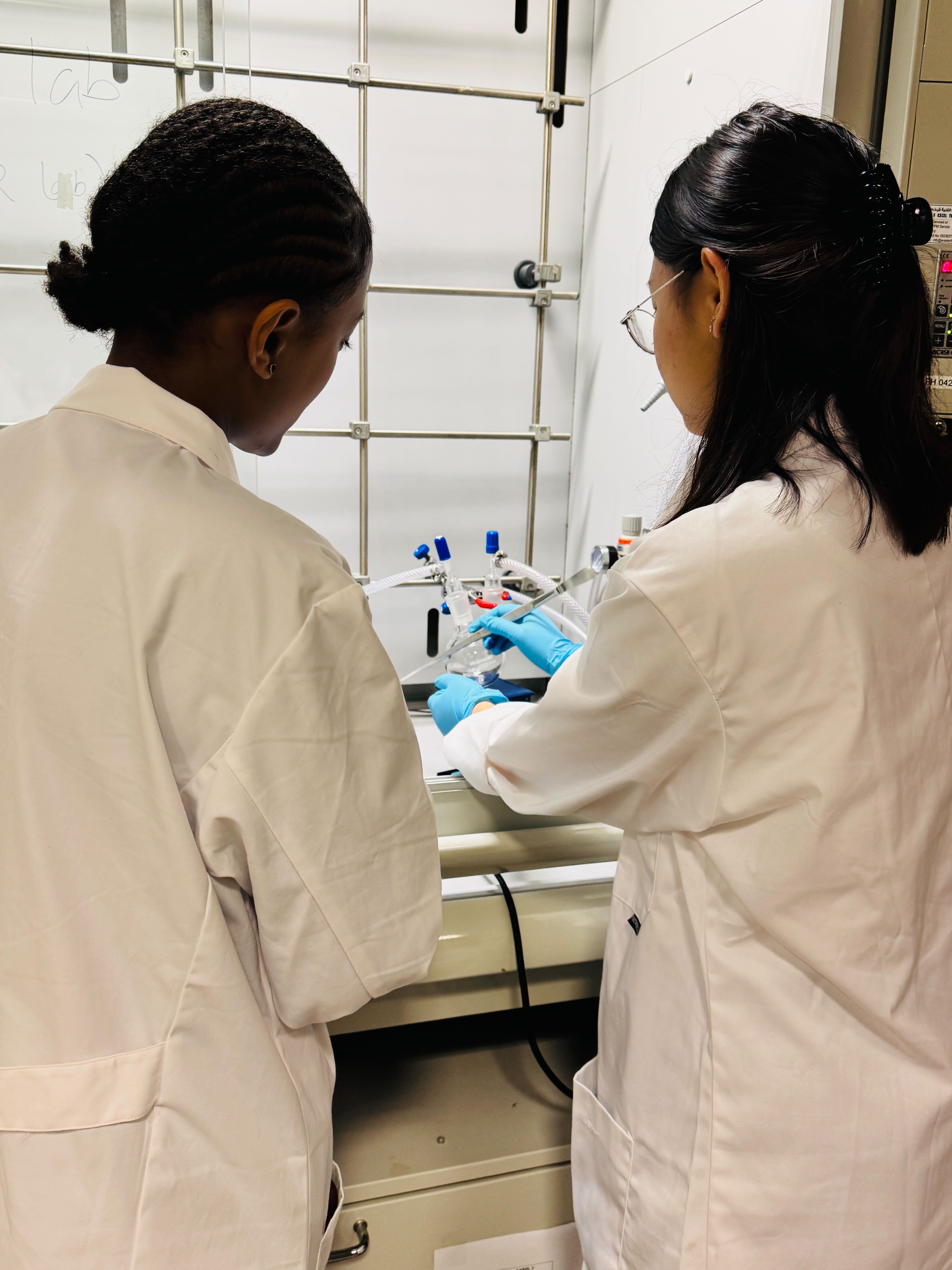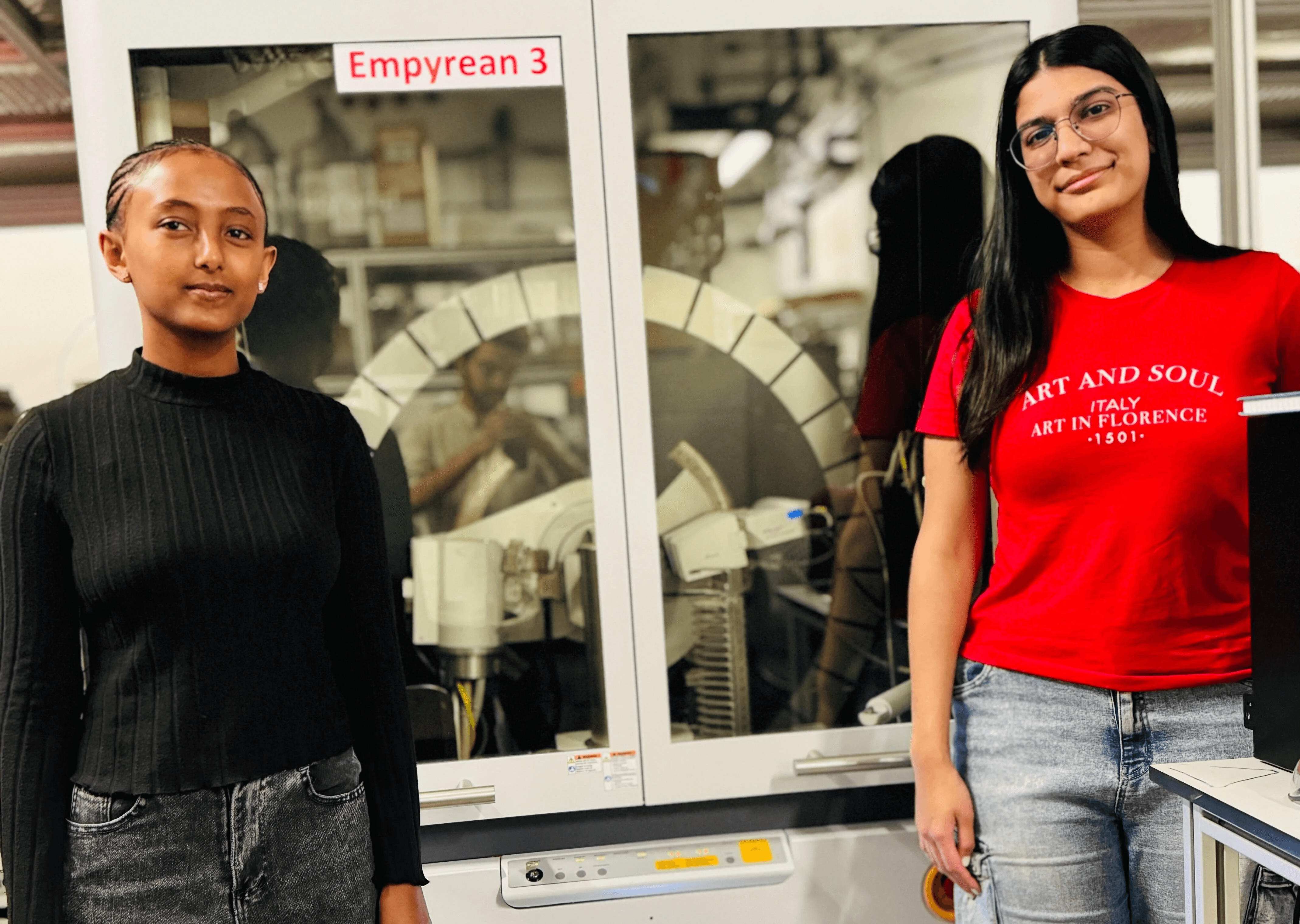Undergraduate students Tsion and Sabah exploring the PXRD as part of the summer internship (2025) under the guidance of Jasil